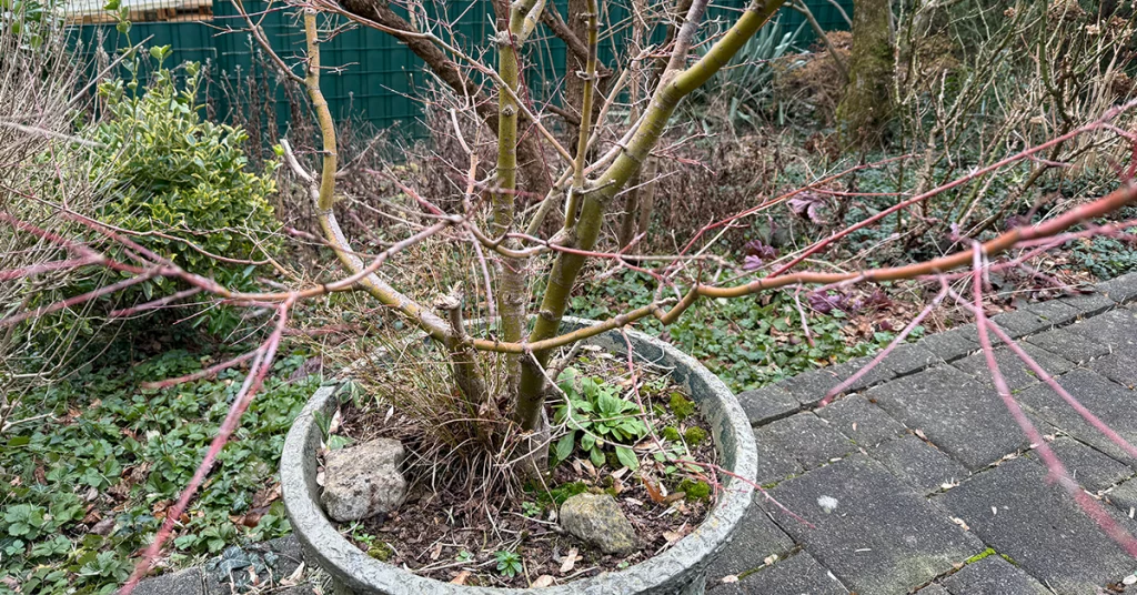 Dazu kommt eine Menge Platz für Blumenkübel aller Art. Auch ein Altbestand an Kübelpflanzen ist vorhanden. Dieser bemitleidenswerte Fächerahorn wurde in der Vergangenheit übel zurückgeschnitten. Mal sehen, ob aus ihm ein schöner und imposanter Garten-Bonsai werden kann.