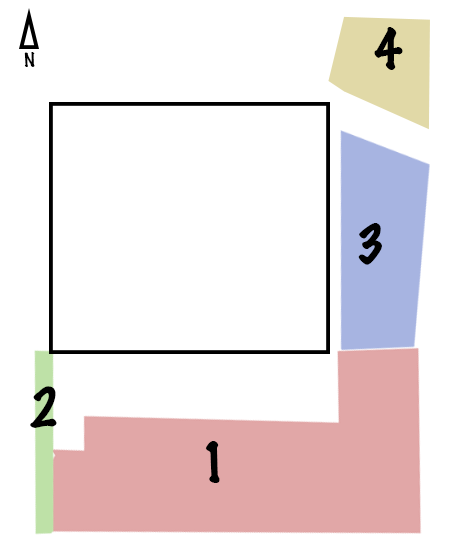 Der Garten liegt in Nord-Süd Richtung und aus dem Wohnzimmer schaut man durch eine große Terrassentüre Richtung Süden. Der Bereich südlich der Terrasse fällt nach Süden hin ab. Hier befindet sich der schon mit allerlei wild zusammengefügten Pflanzen befindliche Hauptgarten. Westlich begrenzt das Grundstück eine Mauer aus Pflanzsteinen. Nordöstlich liegt Bereich 3 und 4 überwiegend schattig unter Bäumen. Der Plan wird sein, alle Bereiche nach und nach naturnah umzugestalten und mit heimischen Pflanzen und aufgelockerten Bereichen Raum für viele unterschiedliche Lebewesen zu schaffen. Dabei soll nach Möglichkeit der alte Bestand mit erhalten bleiben und sich harmonisch in das Gesamtbild einpassen.