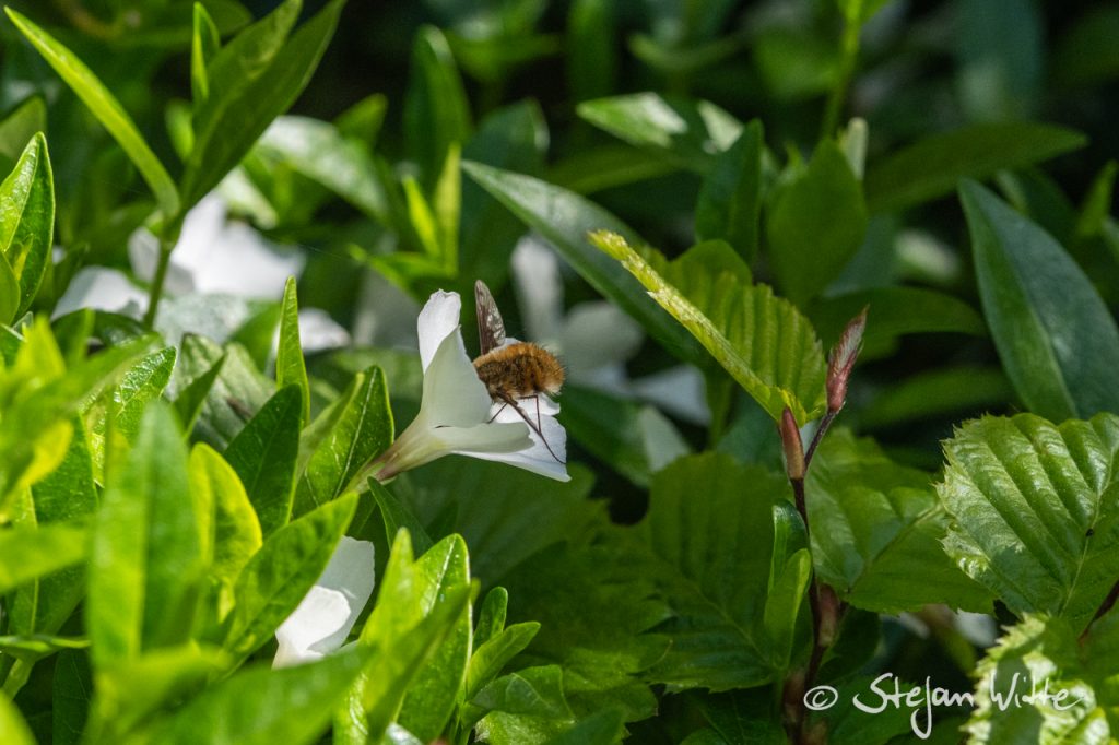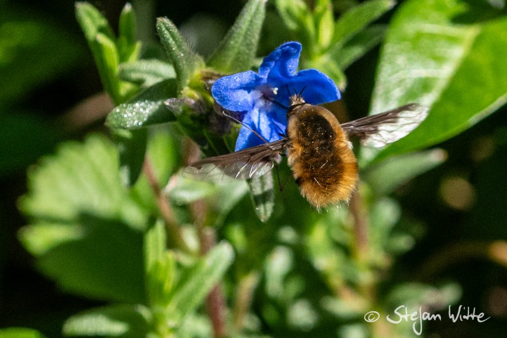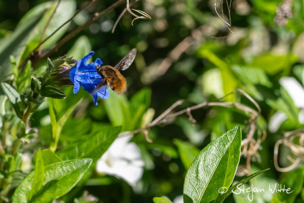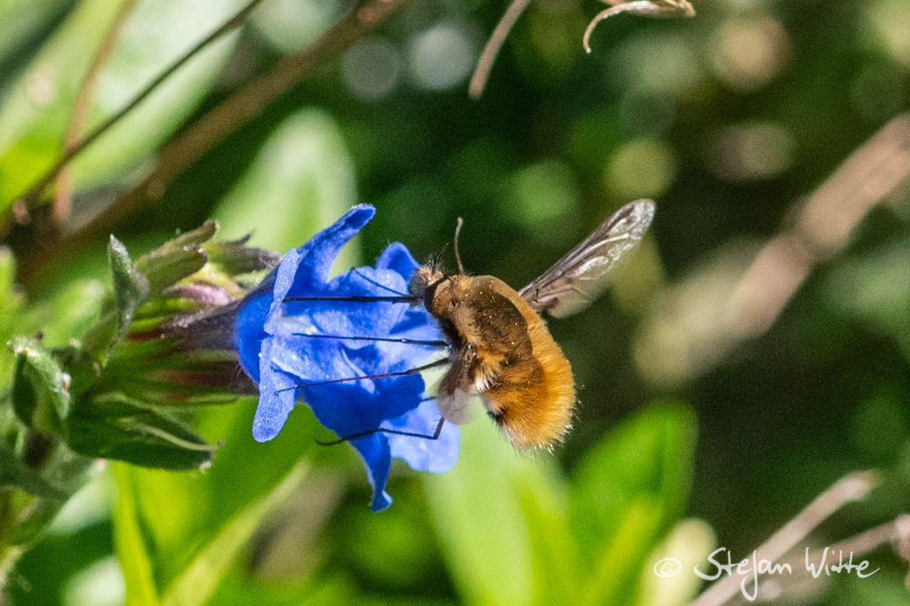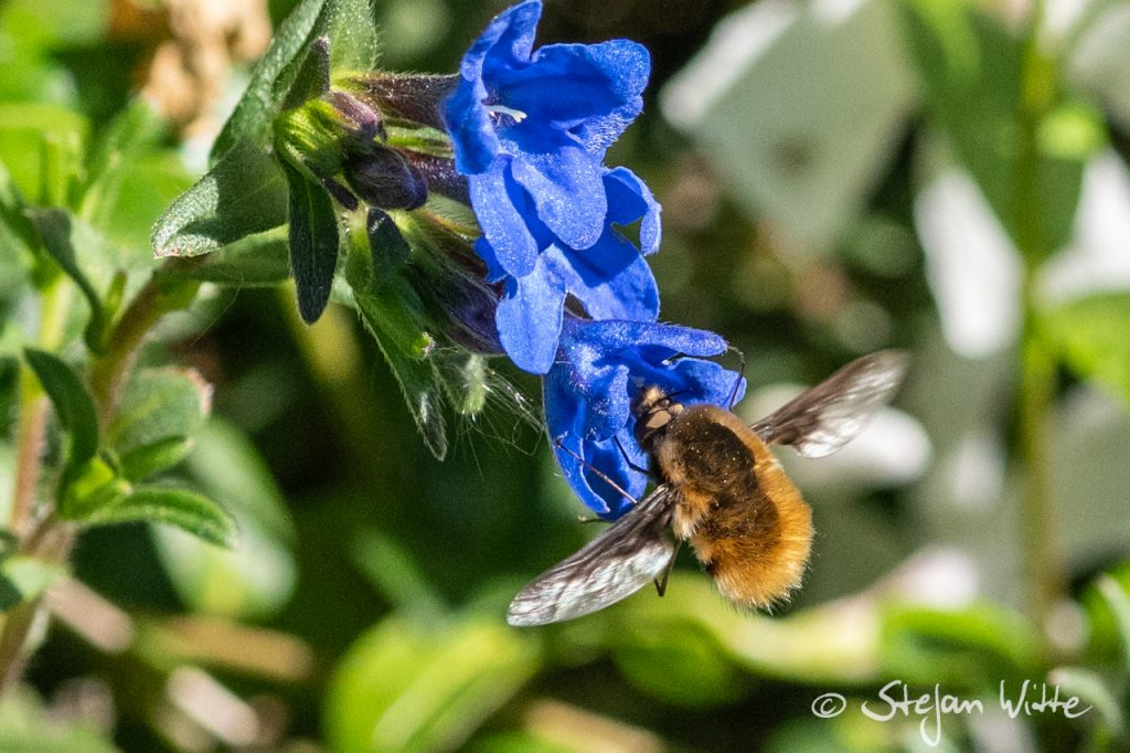 Er fliegt von Blüte zu Blüte und ist dabei machmal ein dankbares Fotomodel – der große Wollschweber. Mit seinem teils schwirrenden Flug und dem Stehen in der Luft schaffte es sogar mein Autofokus, ihn abzulichten. Es gibt einige Wollschweber-Arten, die auf verschiedenen Kontinenten vorkommen.