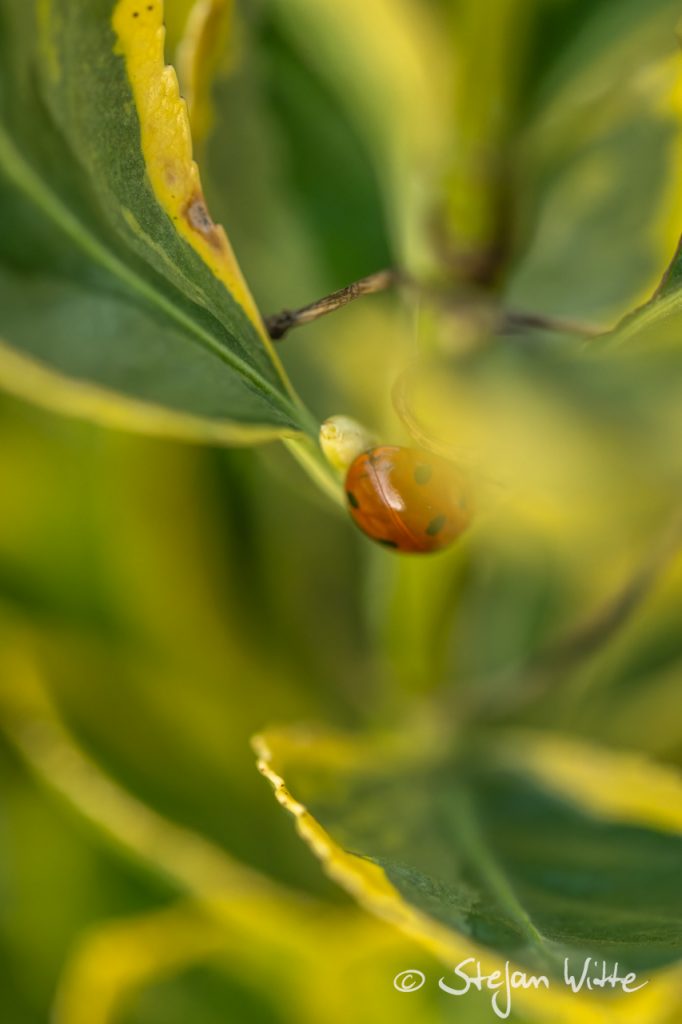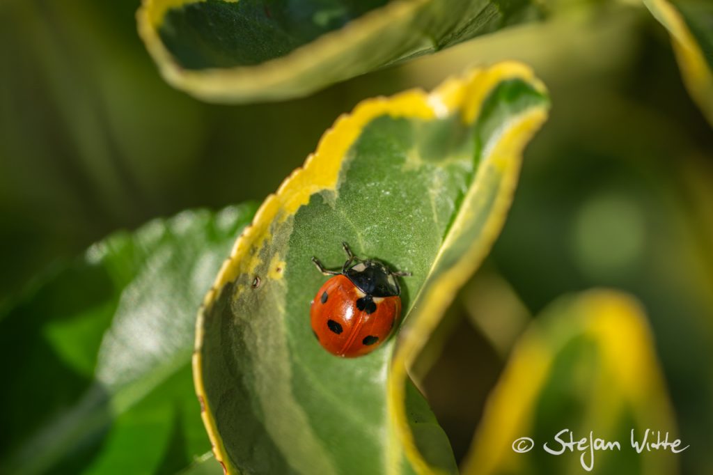 Und plötzlich sind sie da – die ersten Marienkäfer! In der Sonne auf den leuchtenden Blättern eines Zierstrauchs (Sorte muss ich mal noch googeln) hocken gleich fünf von diesen rot in der Sonne leuchtenden Sympathieträgern.