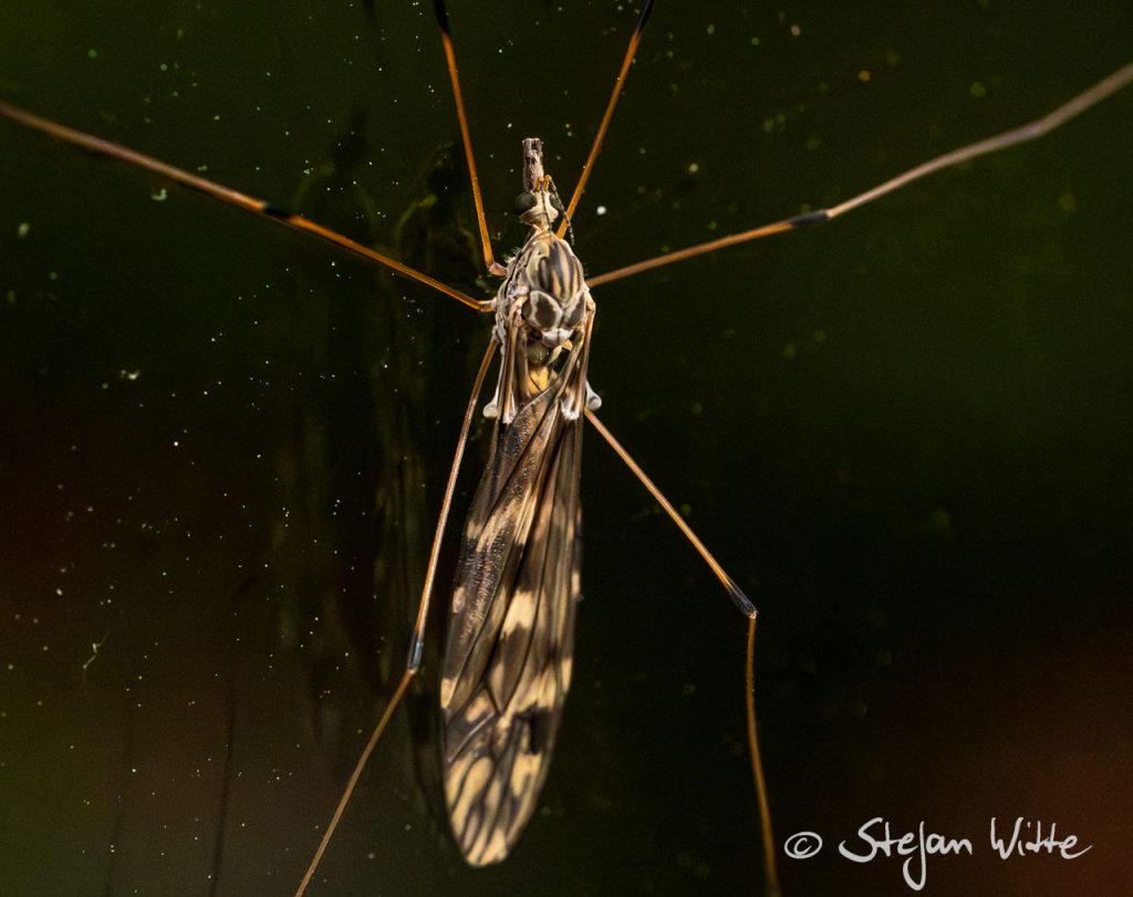 Eigentlich saß die Schnake senkrecht am Fenster- aber in ihrer ganzen Länge passte das Bild besser quer. Sie sind mit den Mücken verwandt, haben aber m Gegensatz zu den Mücken eine sehr positive Eigenschaft – sie können nicht stechen. Ihre Mundwerkzeuge taugen noch nicht einmal zum Anstechen von Pflanzen. Also ernähren sie sich von Nektar oder Honigtau.