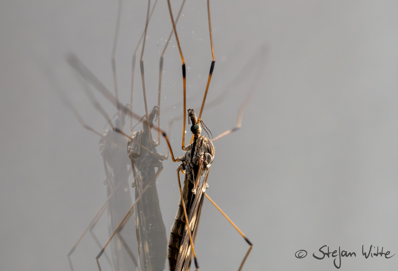 Eigentlich saß die Schnake senkrecht am Fenster- aber in ihrer ganzen Länge passte das Bild besser quer. Sie sind mit den Mücken verwandt, haben aber m Gegensatz zu den Mücken eine sehr positive Eigenschaft – sie können nicht stechen. Ihre Mundwerkzeuge taugen noch nicht einmal zum Anstechen von Pflanzen. Also ernähren sie sich von Nektar oder Honigtau.