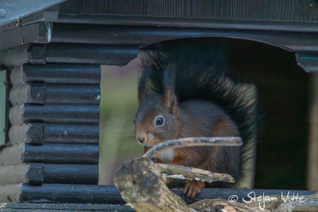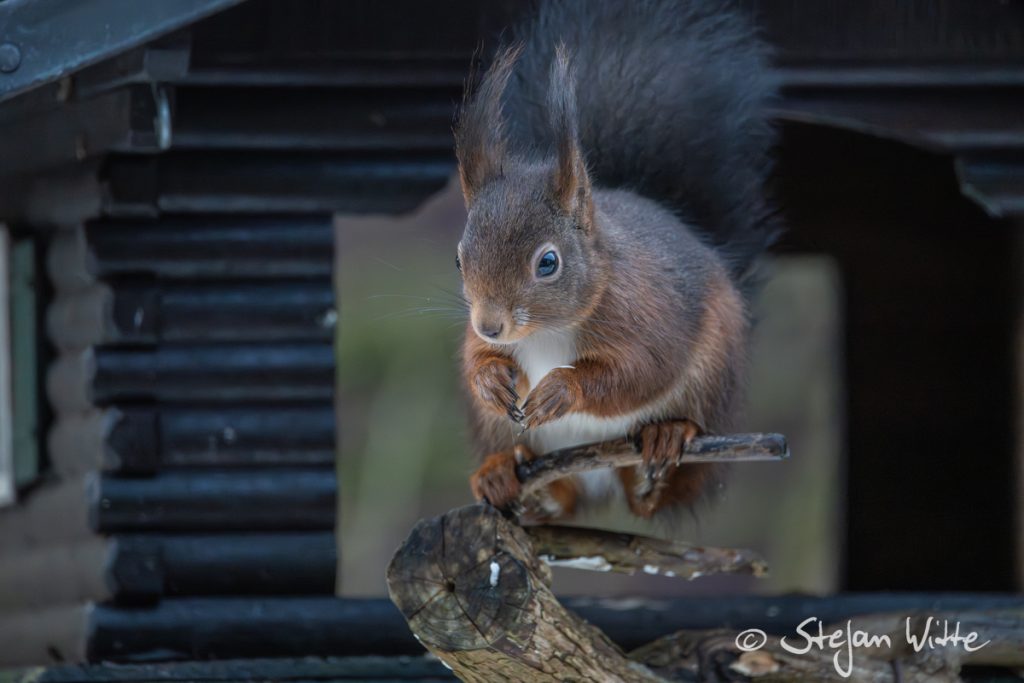 Es ist ja eigentlich klar – wenn im Winter das Buffet eröffnet ist, ist auch das Eichhörnchen nicht weit. Leider hat das einheimische eurasische Eichhörnchen Konkurrenz vom nordamerikanischen Grauhörnchen bekommen. Umso besser, dass hier im Garten erst einmal nur der heimische Vertreter der Hörnchen aktiv geworden ist. Noch viel besser ist aber, dass es aufgrund er günstigen Lage keine vier Meter von meiner Position am Küchentisch entfernt war. So entstehen dann Fotos, bei denen sich unser Haus im Auge des Hörnchens spiegelt.