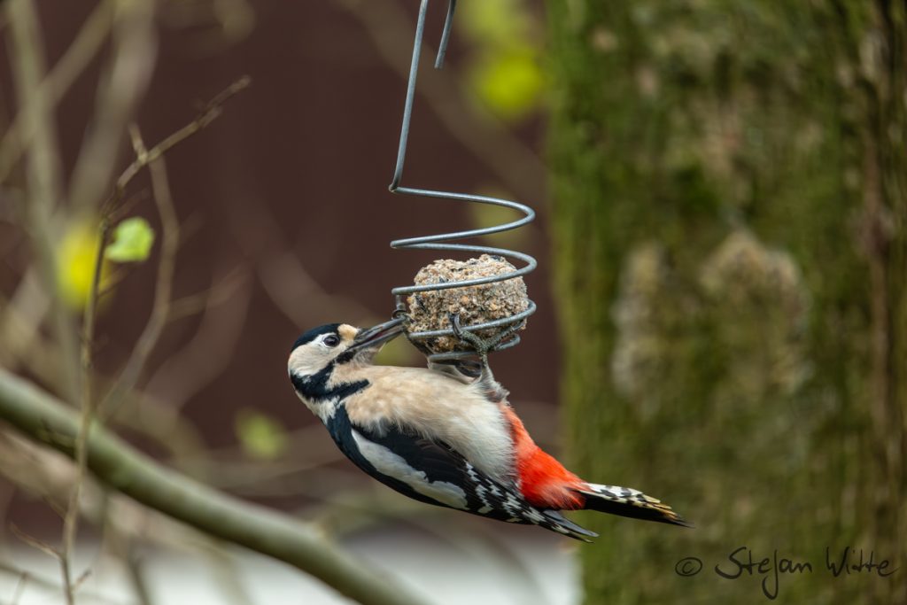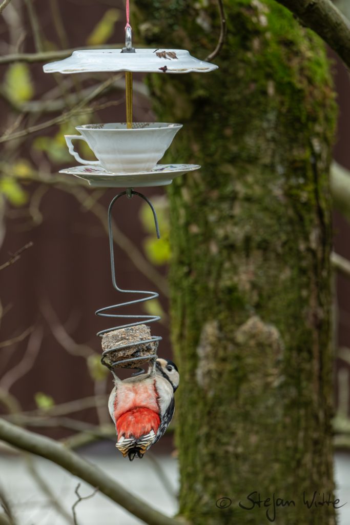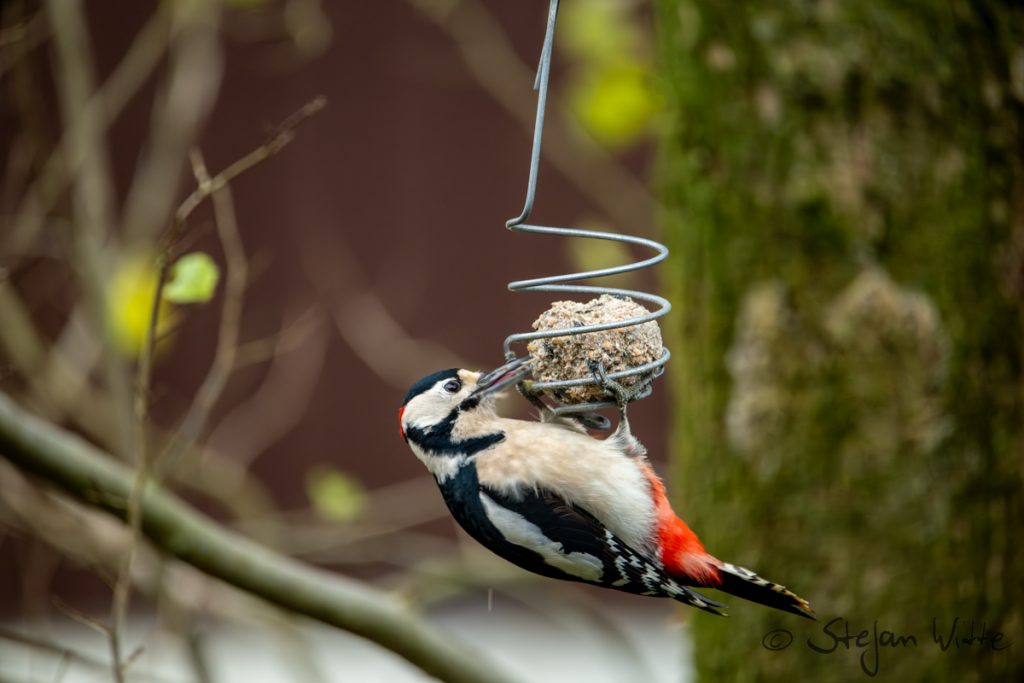 Da staunte wir nicht schlecht, als plötzlich dieser schön gefärbte Buntspecht an den Meisenknödeln hing. Er ist nicht oft zu Gast und im Gegensatz zu vielen anderen Vögeln kann er mit Meisenknödeln eine Menge anfangen. In Deutschland gibt es noch einige sehr ähnliche Arten, beispielsweise Blutspecht und Kleinspecht. Alle sind schön schwarz, weiß und leuchtend rot gefärbt.