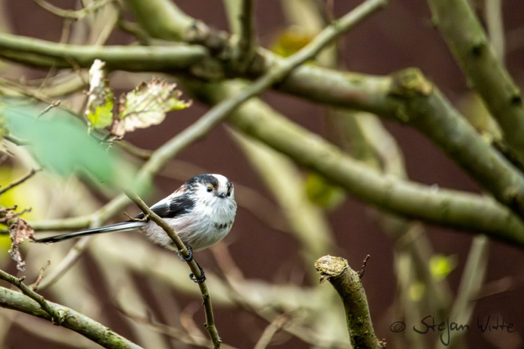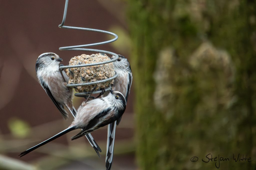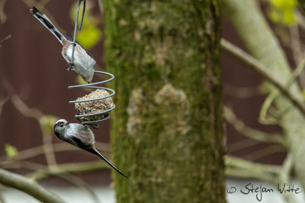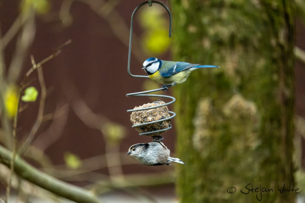 Schwanzmeisen gehören mit zu den drolligsten Vögeln, die wir hier in Mitteleuropa haben. Sie treten in Gruppen auf. Wir hatten teilweise mehr als 10 dieser kleinen Federplümmel in der Goldulme hocken. Sie sind gesellig und teilen sich den Meisenknödel gerne auch mit anderen Vögeln aus verwandten Arten – zum Beispiel hier auch mit Blaumeisen. Die Schwanzmeise kommt in verschiedenen Unterarten vor, Richtung Nord- und Osteuropa ist der Kopf nahezu komplett weiß.